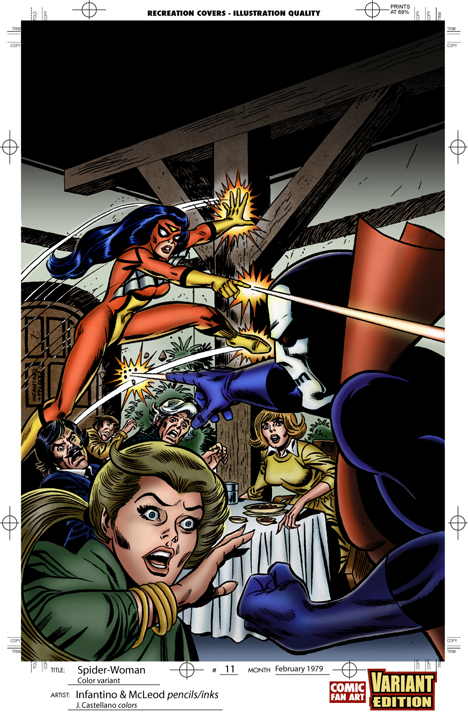 First I wasn't quite sure who the artist was but as per samruby.com and comics-db.com it's Infantino with McLeod on inks. I added the artist signatures and made changes to Brother Grimm's eyes--the way it was in Spider-Woman #3. I played with the lighting a bit.