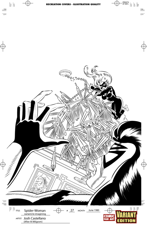 Variant-Edition.com is an online portfolio and features comic fan art illustrations by artist/fan Josh Castellano. The portfolio includes illustrations of recreations and re-imaginings, electronic coloring, and eventually orignal work. The main subject matter of recreations and re-imaginings focuses around the Spider-Woman character and placing her in current titles and storylines in a "What-if Spider-Woman was never cancelled" scenario as well as outlining a brief storyline. Variant-Edition.com is updated monthly. All artwork and designs are owned, trademarked and © copyright 2013 by Josh Castellano. All characters have © copyrights from their respective publishers. For questions and comments, email: josh(at)variant-edition.com. |