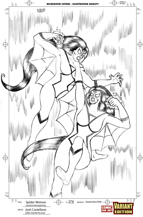 Variant-Edition.com is an online portfolio and features comic fan art illustrations by artist/fan Josh Castellano. The portfolio includes illustrations of recreations and re-imaginings, electronic coloring, and eventually orignal work. The main subject matter of recreations and re-imaginings focuses around the Spider-Woman character and placing her in current titles and storylines in a "What-if Spider-Woman was never cancelled" scenario as well as outlining a brief storyline. Variant-Edition.com is updated monthly. All artwork and designs are owned, trademarked and © copyright 2013 by Josh Castellano. All characters have © copyrights from their respective publishers. For questions and comments, email: josh(at)variant-edition.com. |
